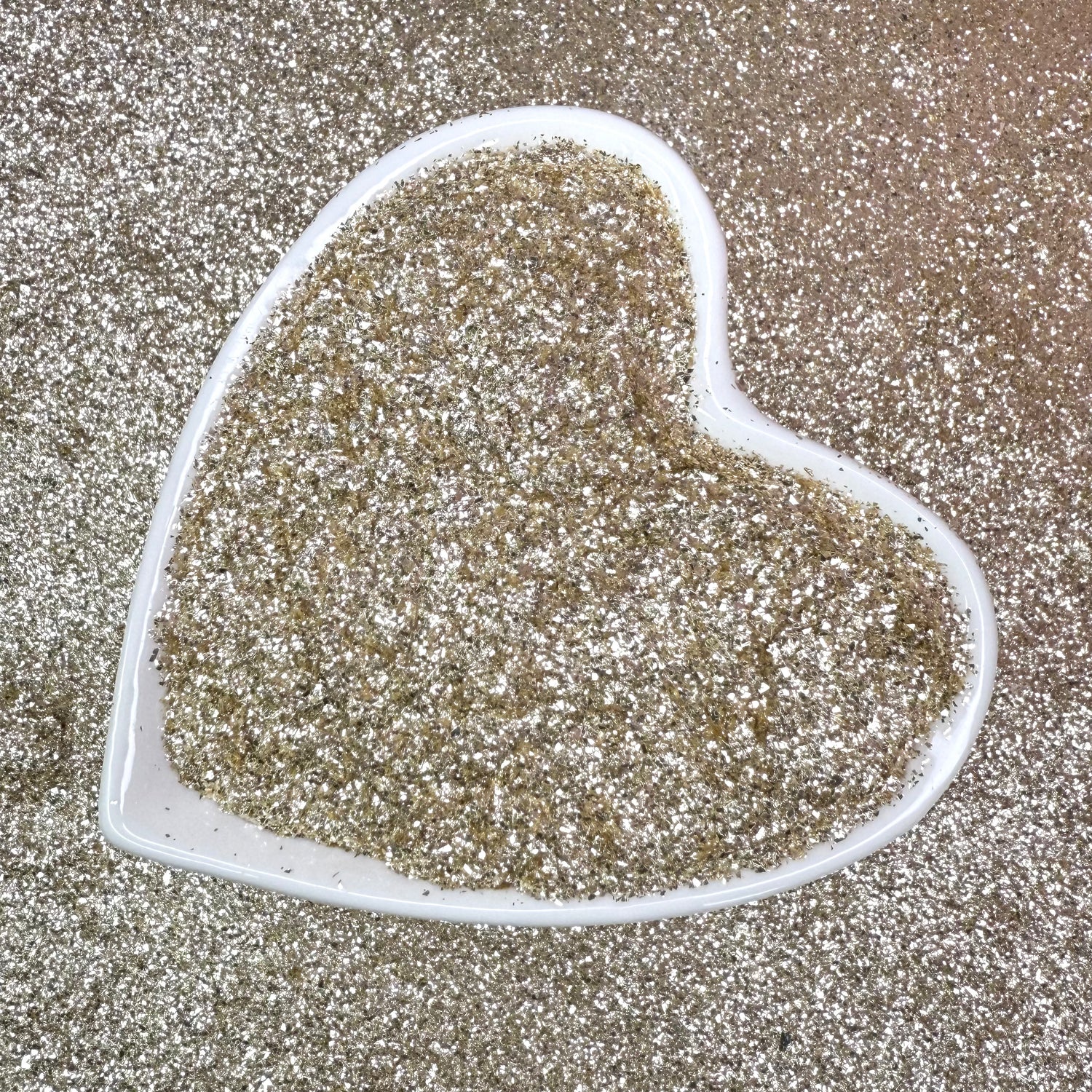 This is one of the pretties gold glitters I have used, It is made up of tiny irregularly shaped glitter shards. They are tiny, I had no issue covering these with epoxy, no sanded was needed. They provide a very unique shine. Super gorgeous