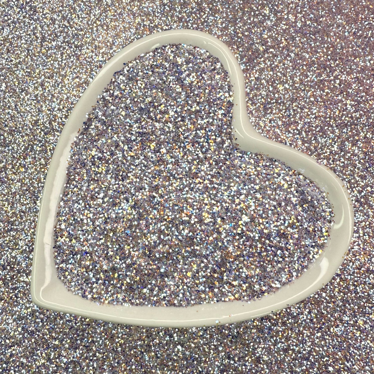 This is fine glitter, it's a gorgeous silver-ish with a hit of opal iridescent, and almost a rainbow shift. This glitter reflects so many beautiful colors. I wish the photo was more accurate to how beautiful this cup is in person.